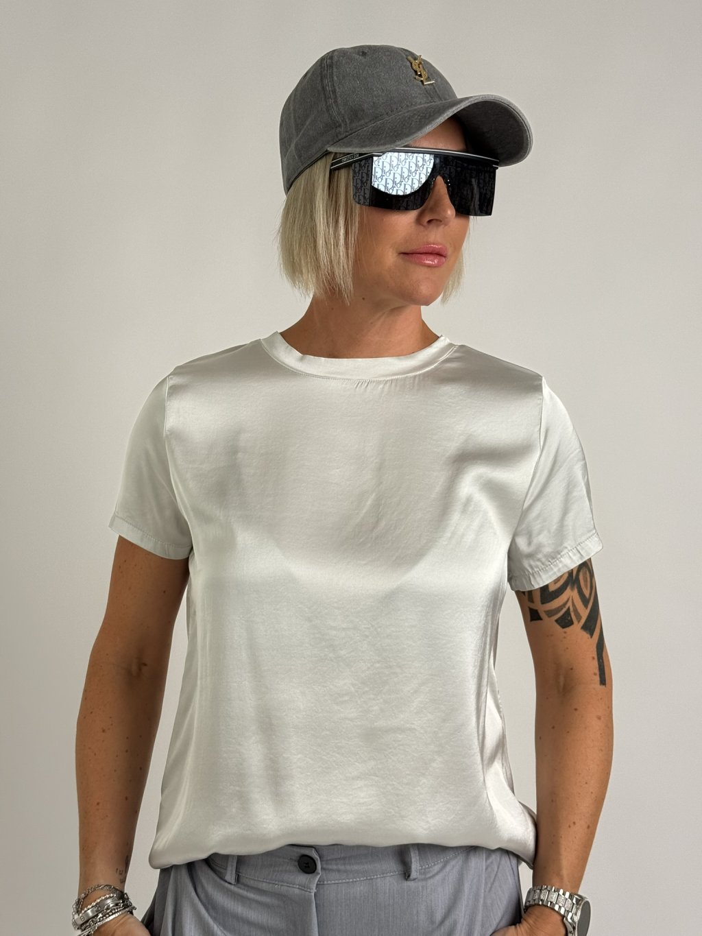 Jednoduchá, saténová, elastická blúzka s krátkymi rukávmi a okrúhlym výstrihom. Skvele sa hodí ku nohaviciam, sukniam a džínsom.