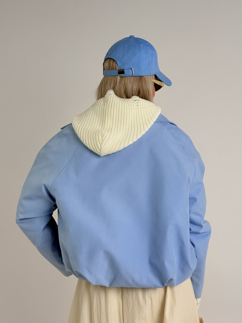 Svetlomodrá bunda alebo kabát s podšívkou, raglánovými rukávmi, golierom, čiernymi gombíkmi, záhybmi na spodnom okraji a nášivkami na vreckách.