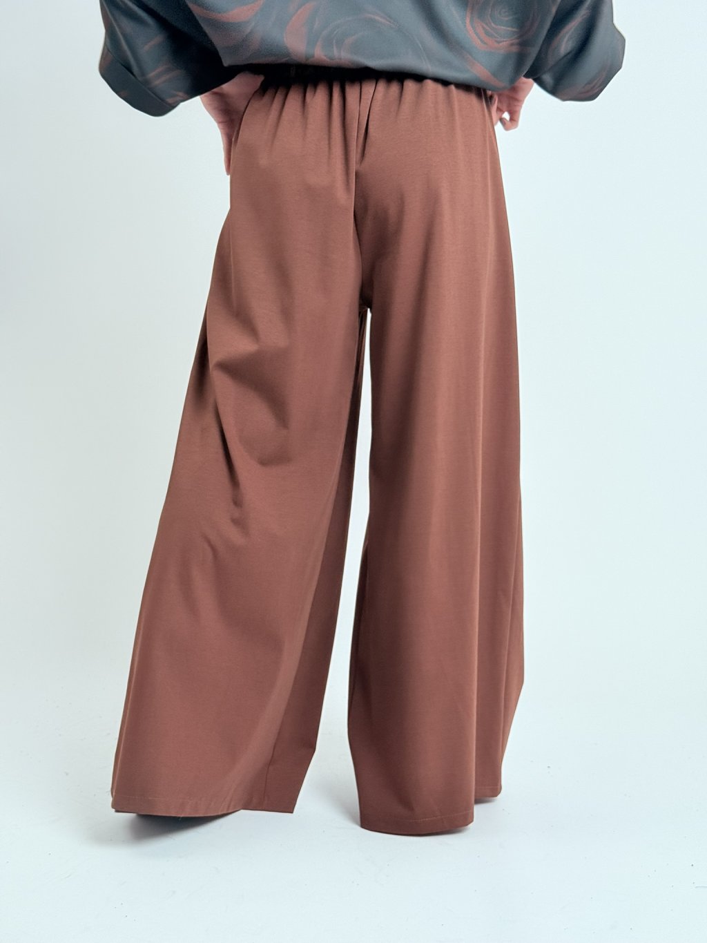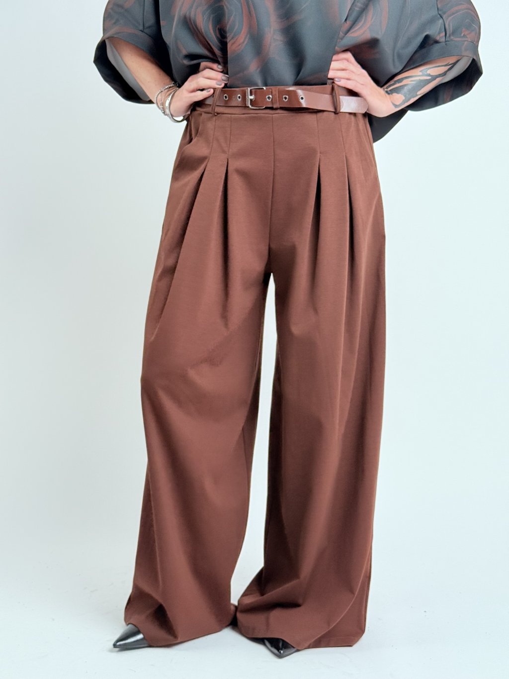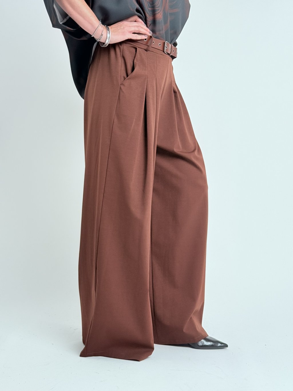 Dokonalé široké nohavice s elastickým pásom, opaskom a bočnými vreckami.