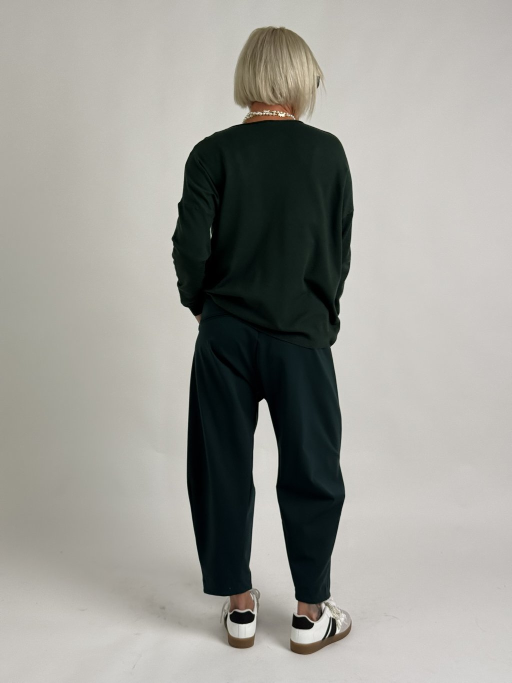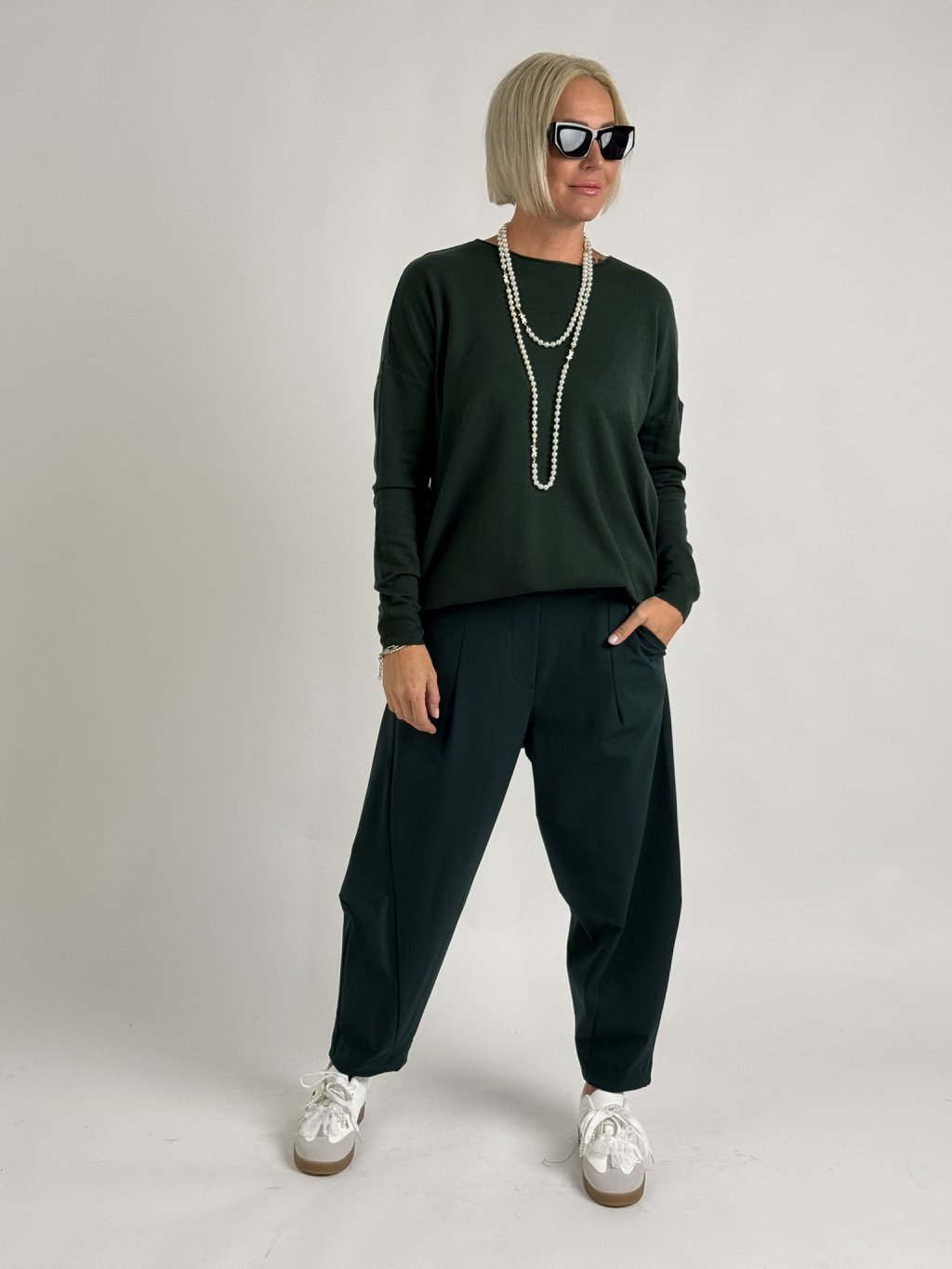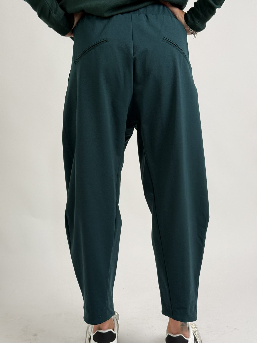 Luxusné nohavice s elastickým pásom, širšie nohavice v hornej časti, zužujúce sa smerom nadol. Super strih a materiál.