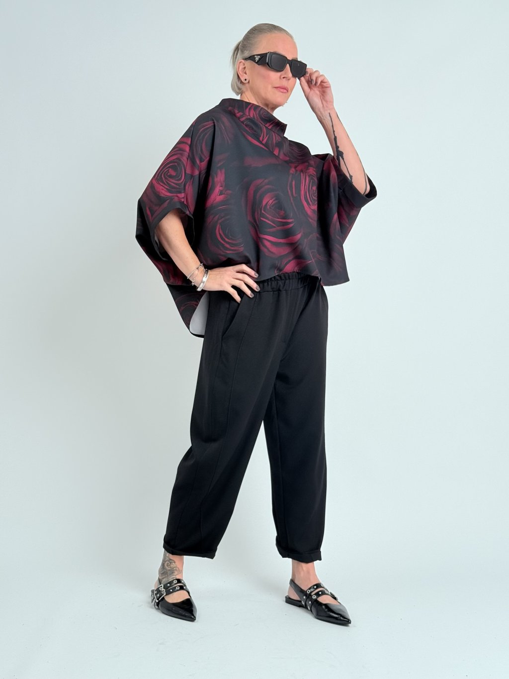 Luxusná tunika netopierieho strihu so širokým stojacím golierom. Vhodná na vrstvenie.
