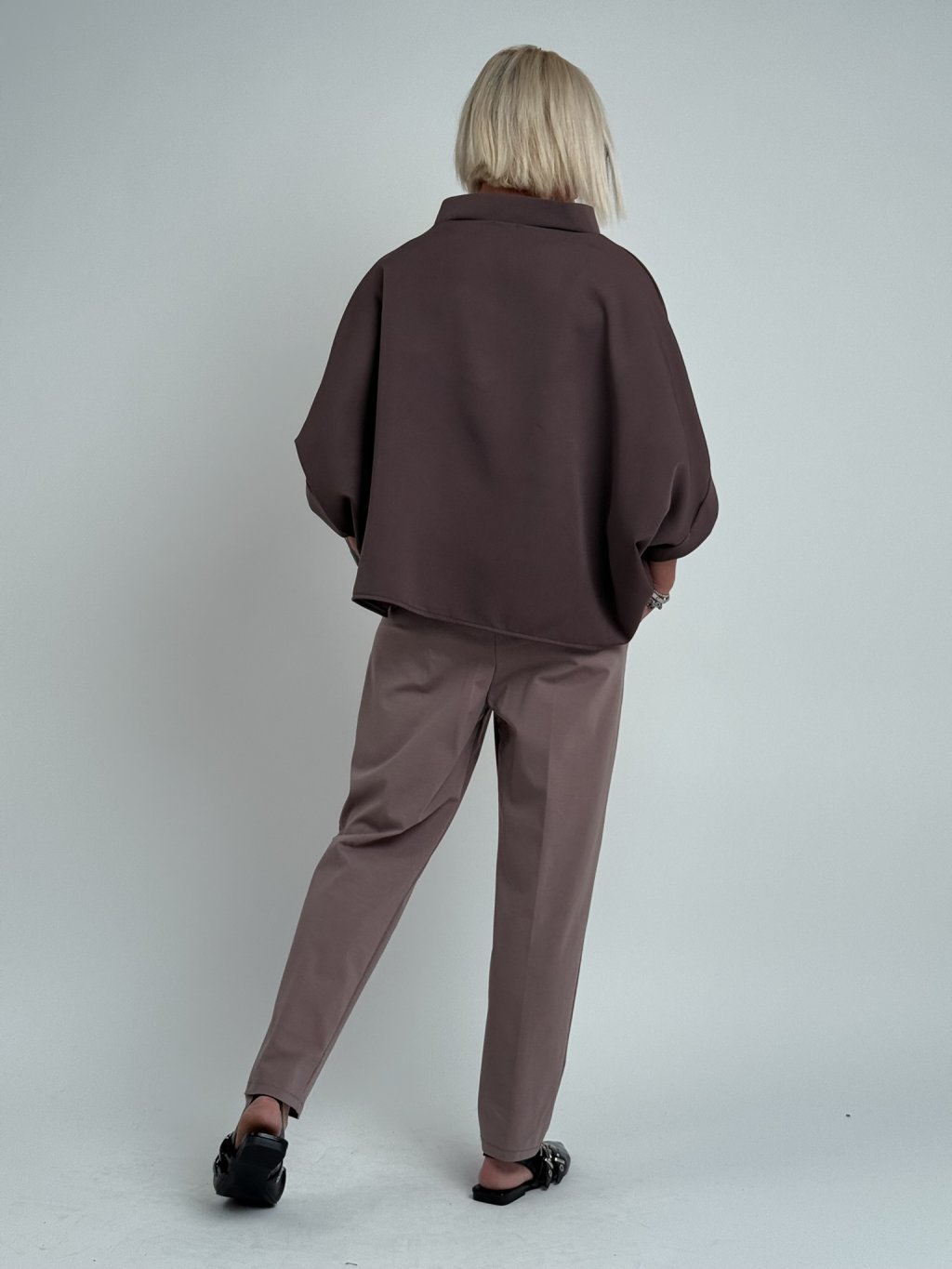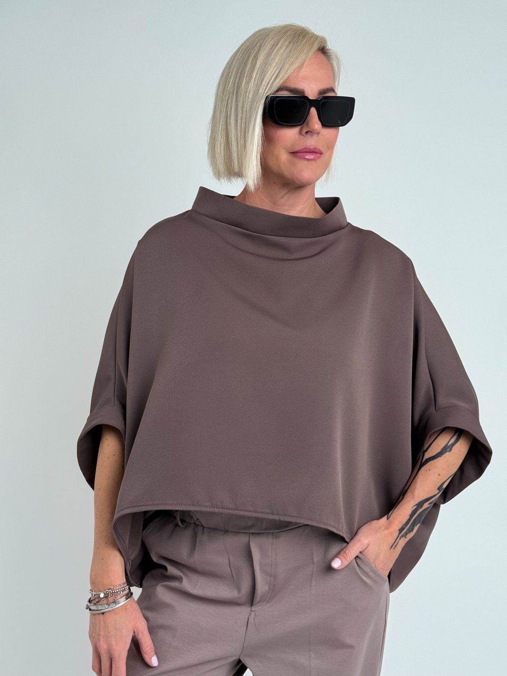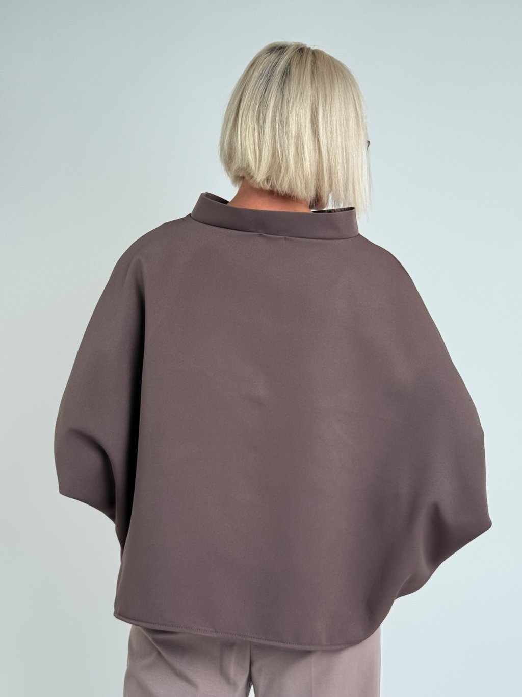 Luxusná tunika netopierieho strihu so širokým stojacím golierom. Vhodná na vrstvenie.