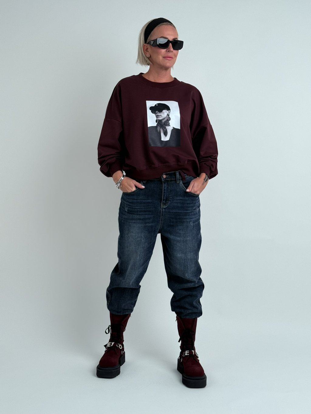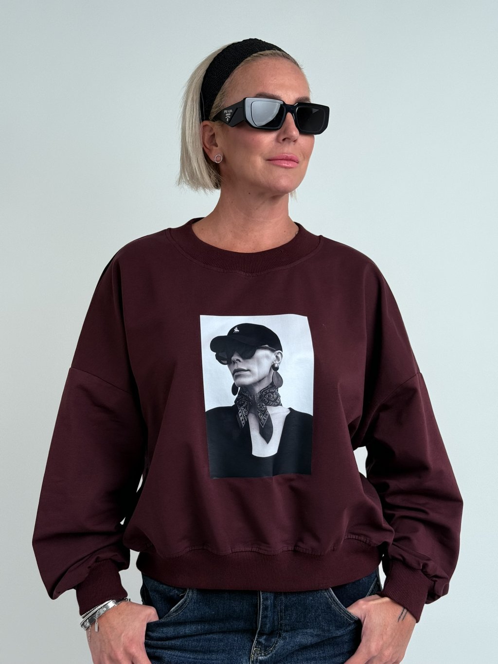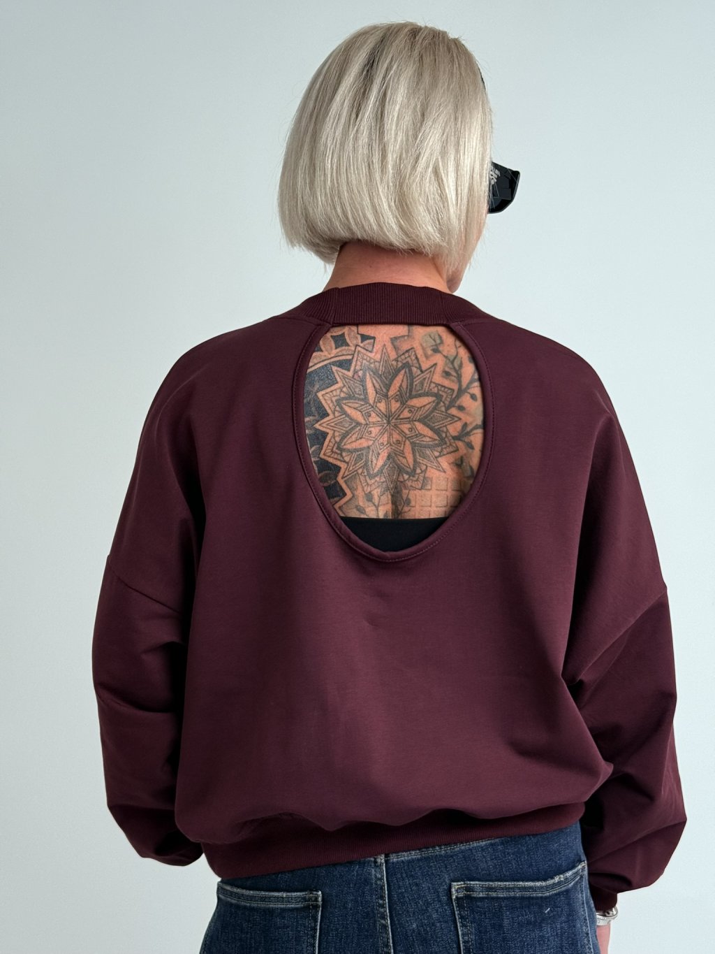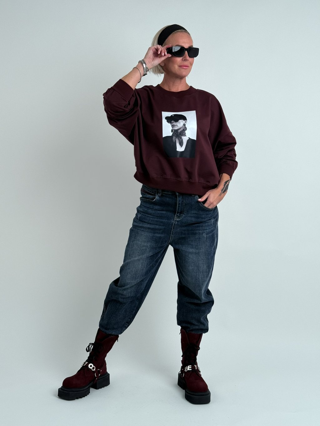 Mikina úzkeho strihu so zadným vetraním, potlačou na prednej strane a dlhými rukávmi.