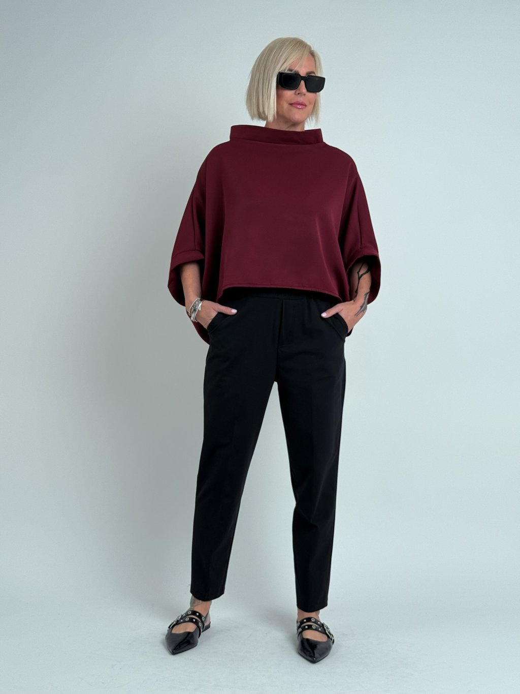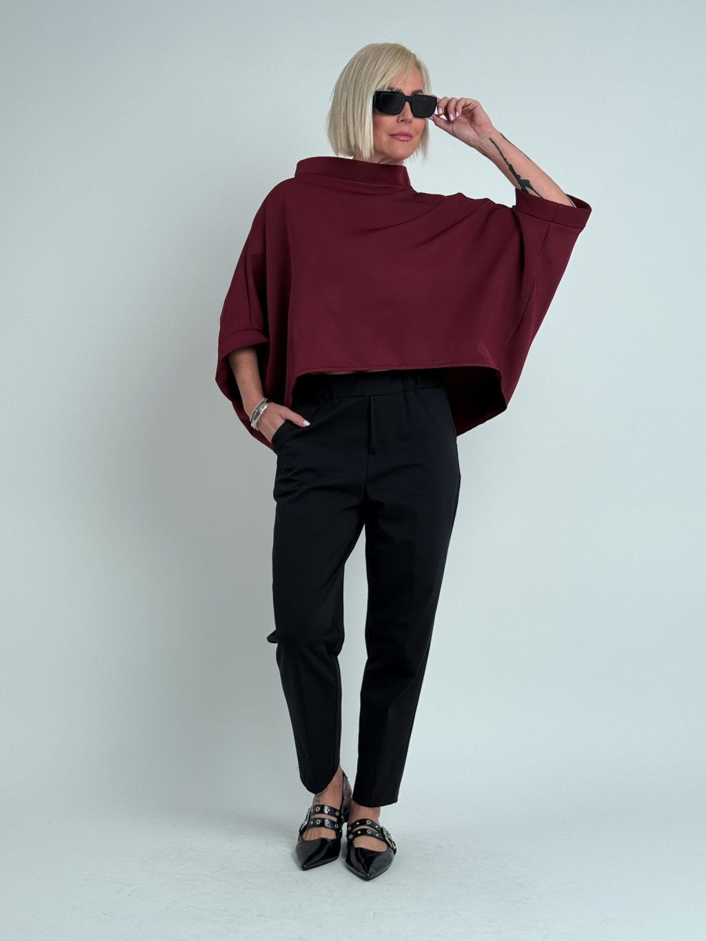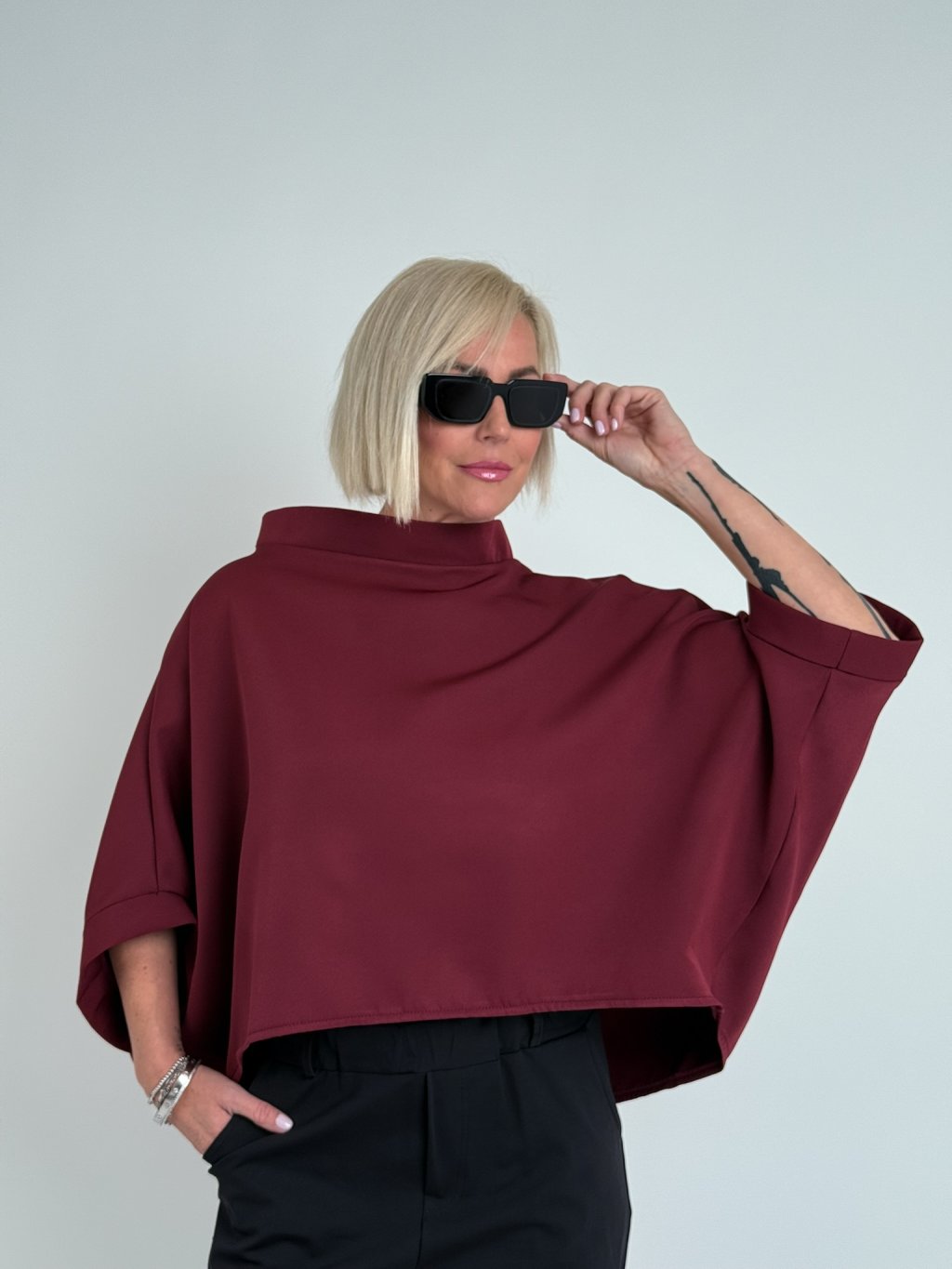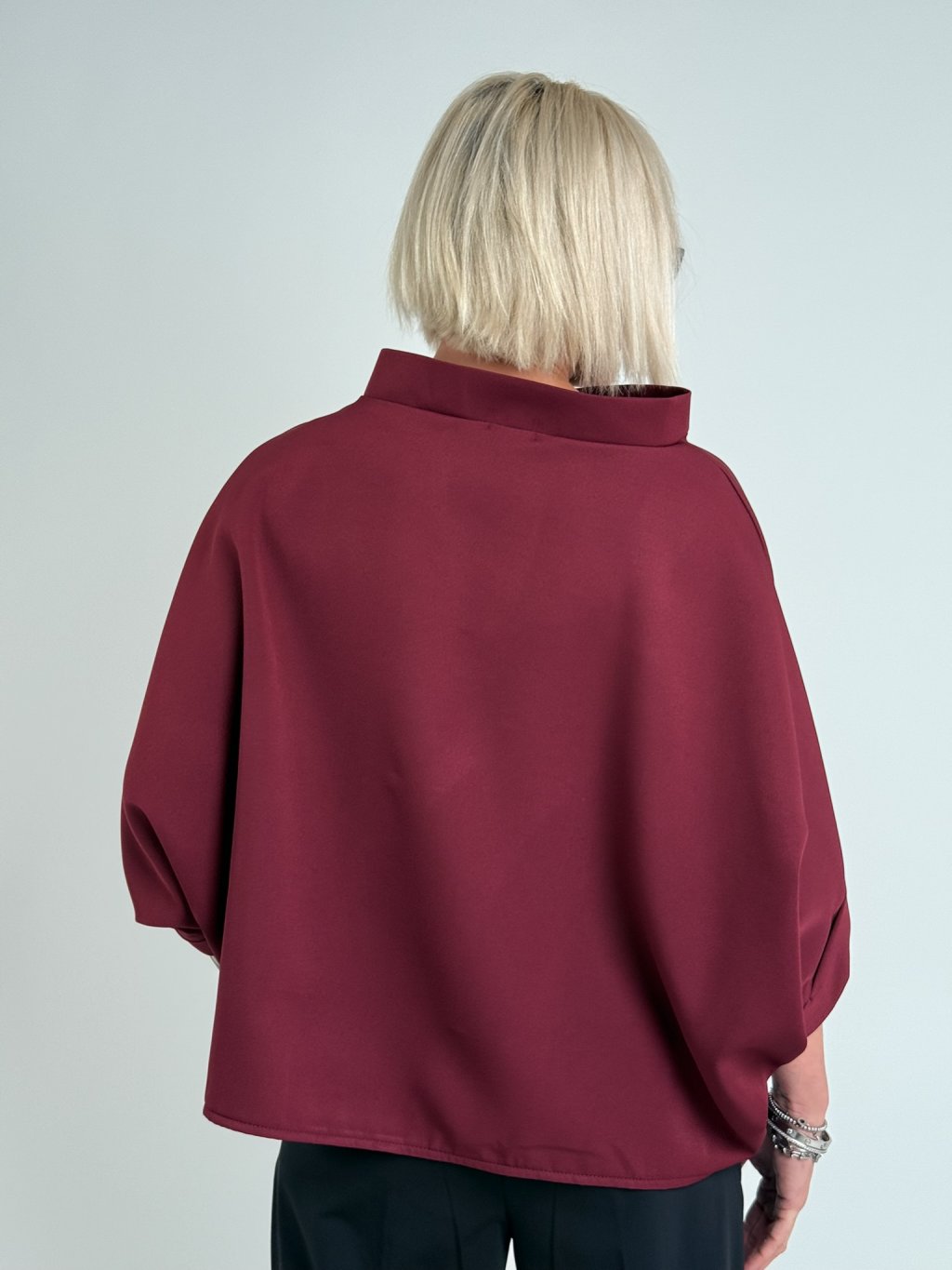 Luxusná tunika netopierieho strihu so širokým stojacím golierom. Vhodná na vrstvenie.
