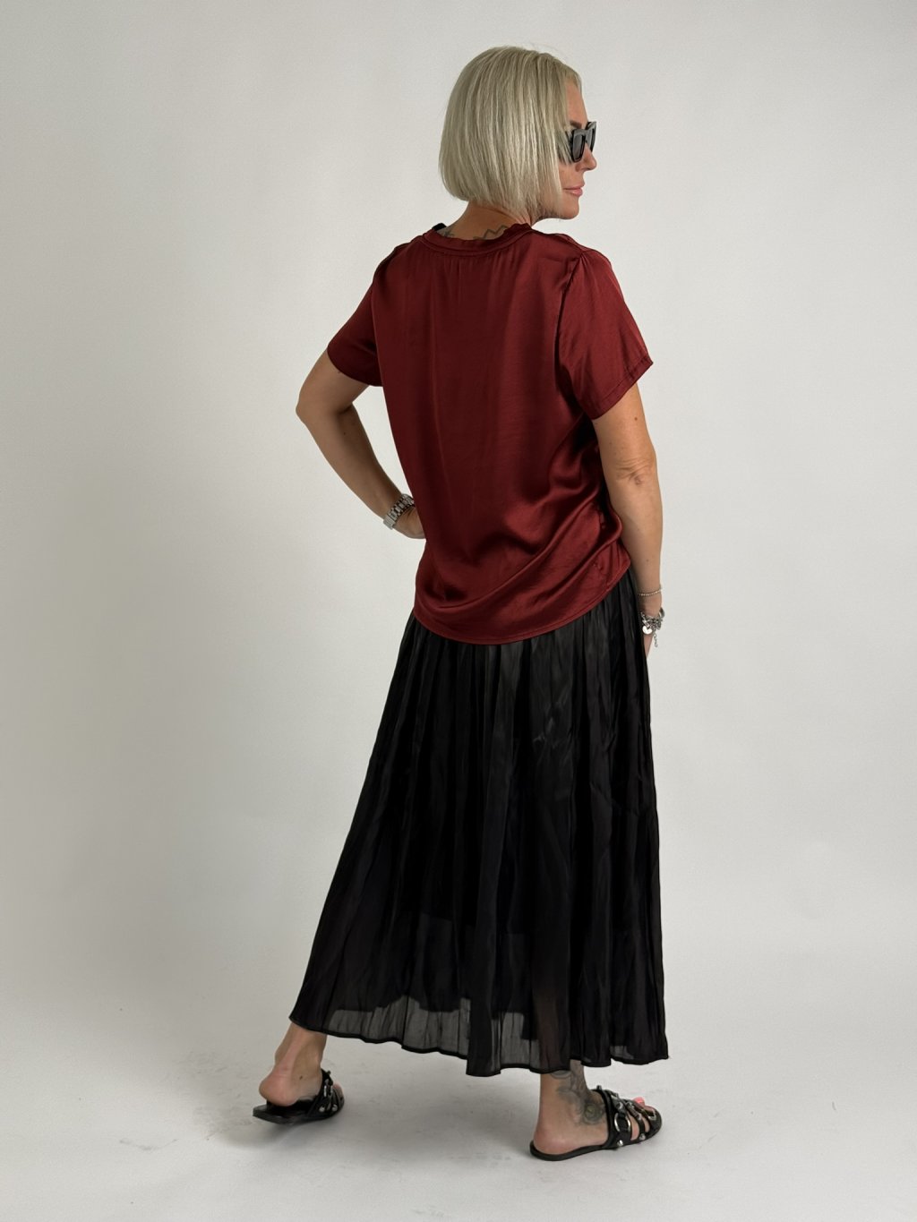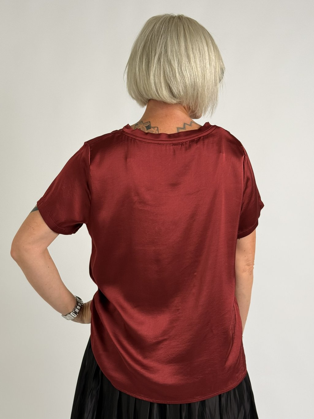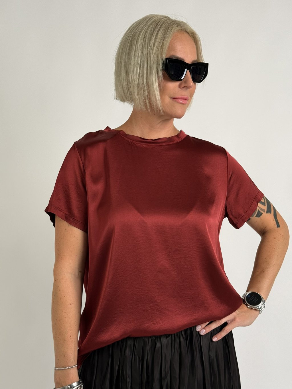 Jednoduchá, saténová, elastická blúzka s krátkymi rukávmi a okrúhlym výstrihom. Skvele sa hodí ku nohaviciam, sukniam a džínsom.