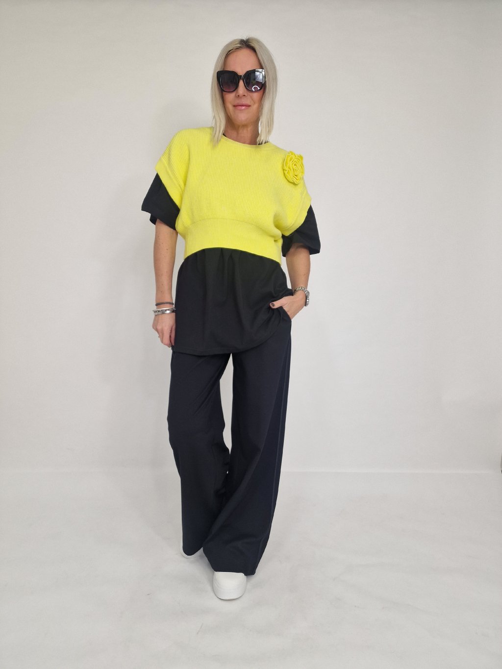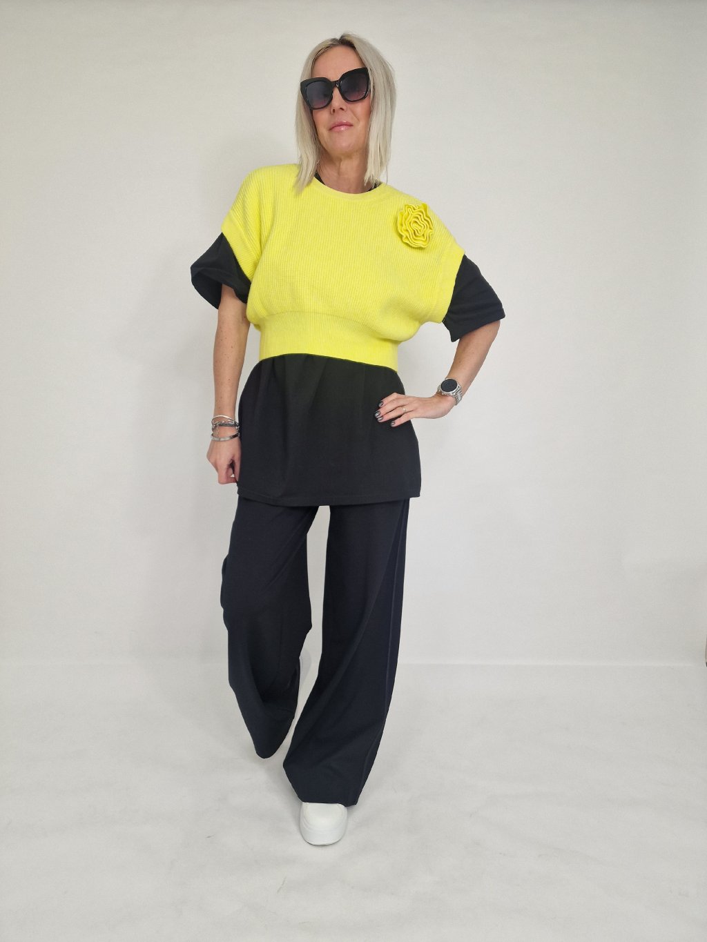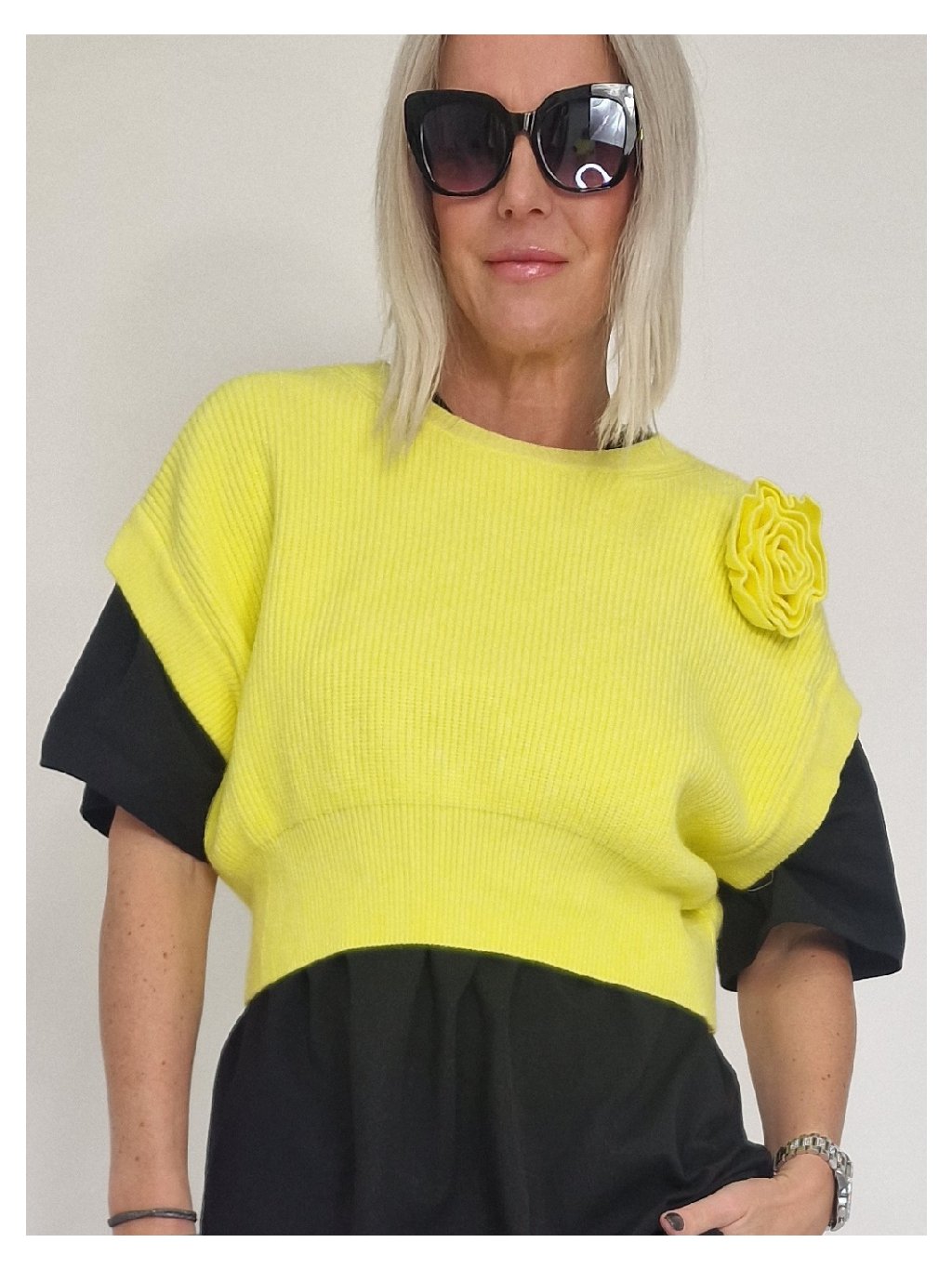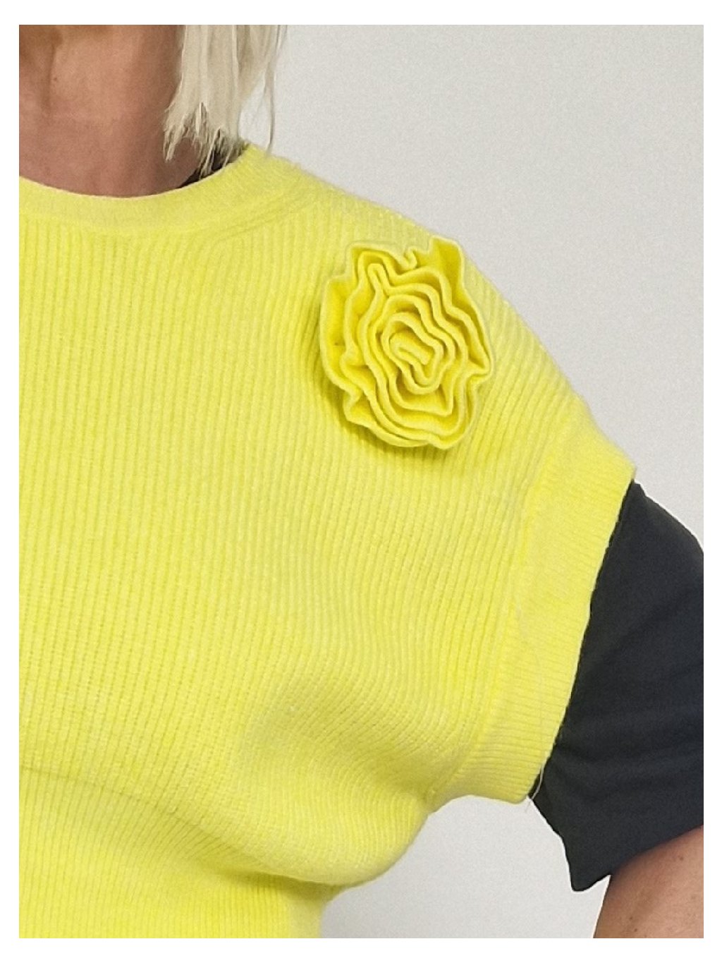 Skvelá krátka vesta so spadnutými rukávmi a kvetinovou aplikáciou, ktorú možno nosiť na mnoho spôsobov. Samostatne, cez tričko, dlhé tričko, košeľu alebo pencil šaty.